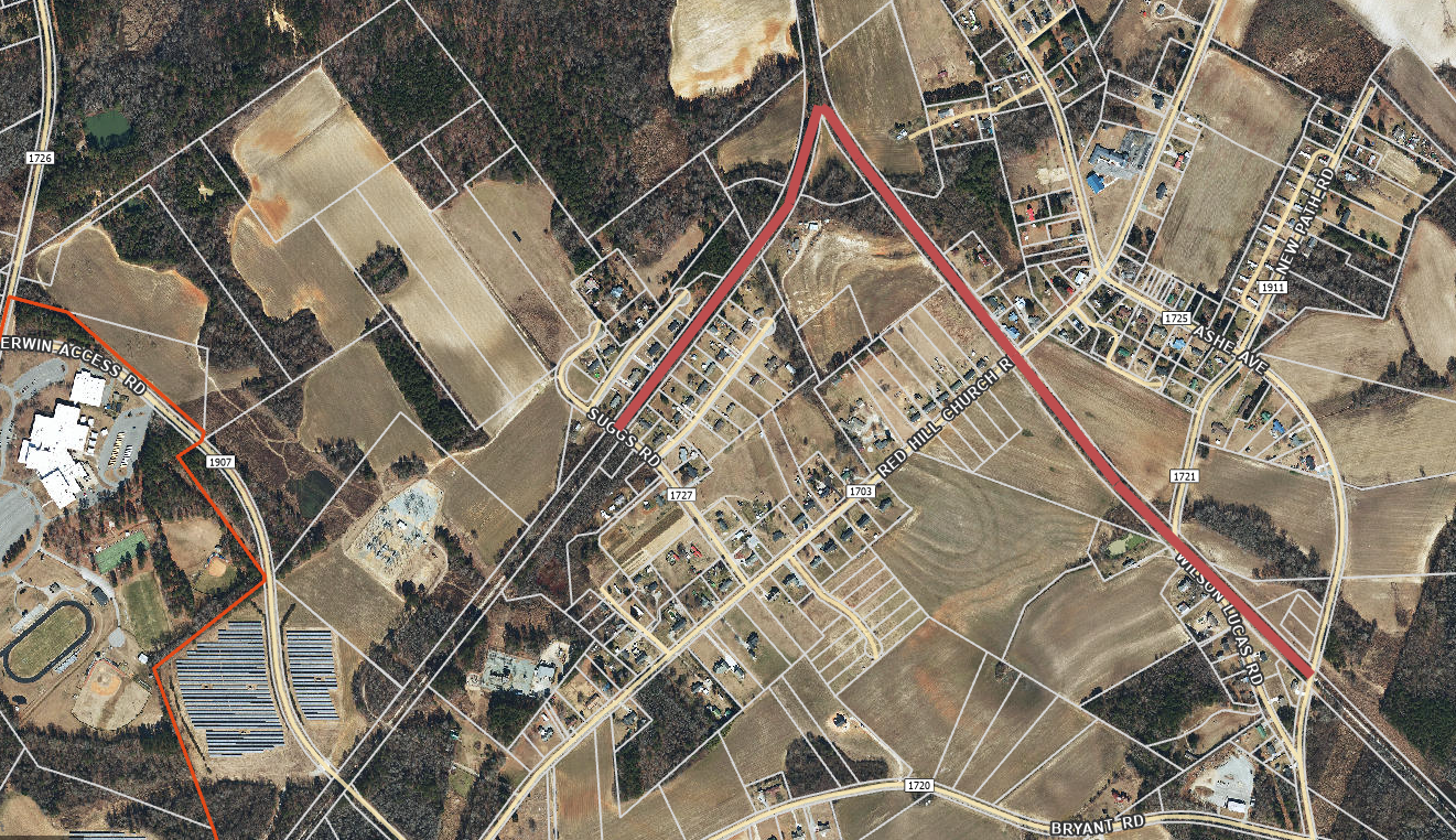 *A section of the Dunn-Erwin Rail Trail will be closing on Sat, January 10 and Sun, January 11, 2026 for mulching along the trail. The section closing will be from Suggs Road to Ashe Avenue. A rough overhead map image is below with the trail section to be closed in red*